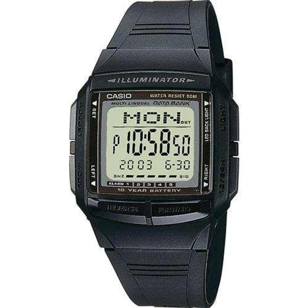 Casio DB-36-1AVEF – одна из наиболее востребованных моделей коллекции. Лаконичный дизайн не предвещает на первый взгляд ничего особенного. Но внутри этого простого с виду девайса скрыт огромный потенциал. Пластиковый черный корпус гармонично сочетается с каучуковым ремешком такого же цвета. Часы выдерживают давление воды до 3 АТМ. На циферблате серого цвета информация отображается в электронном виде. Модель Casio DB-36-1AVEF имеет ряд специфических возможностей. Встроенный телефонный справочник рассчитан на 30 номеров. Так само в цьому виробі передбачено наявність подвійного часу, світлодіодне підсвічування, секундоміра на 1/100 з і 5 багатофункціональних будильників.